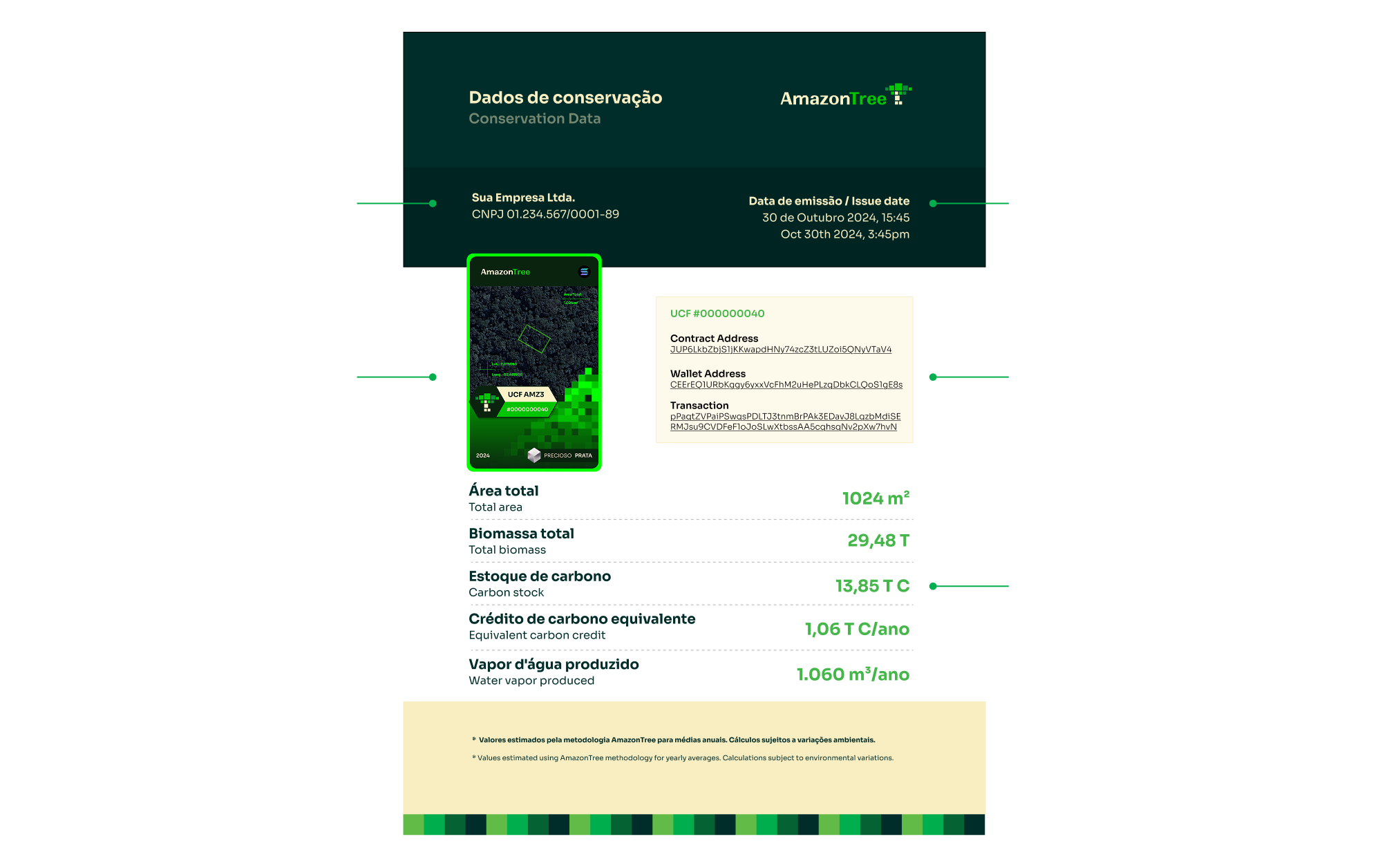 Para cada fração de área conservada, é emitido um Certificado de Conservação Ambiental, vinculado a uma Unidade de Conservação Florestal (UCF). Esse certificado consolida os indicadores ambientais associados — como o potencial de sequestro de carbono e a localização georreferenciada da área — assegurando a rastreabilidade e a transparência do serviço prestado.